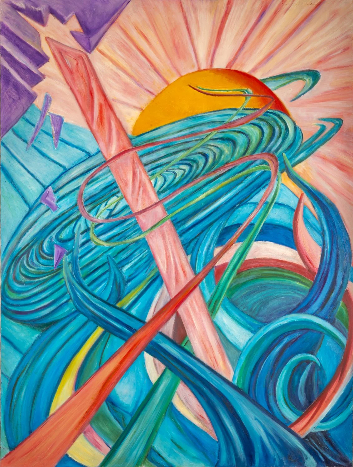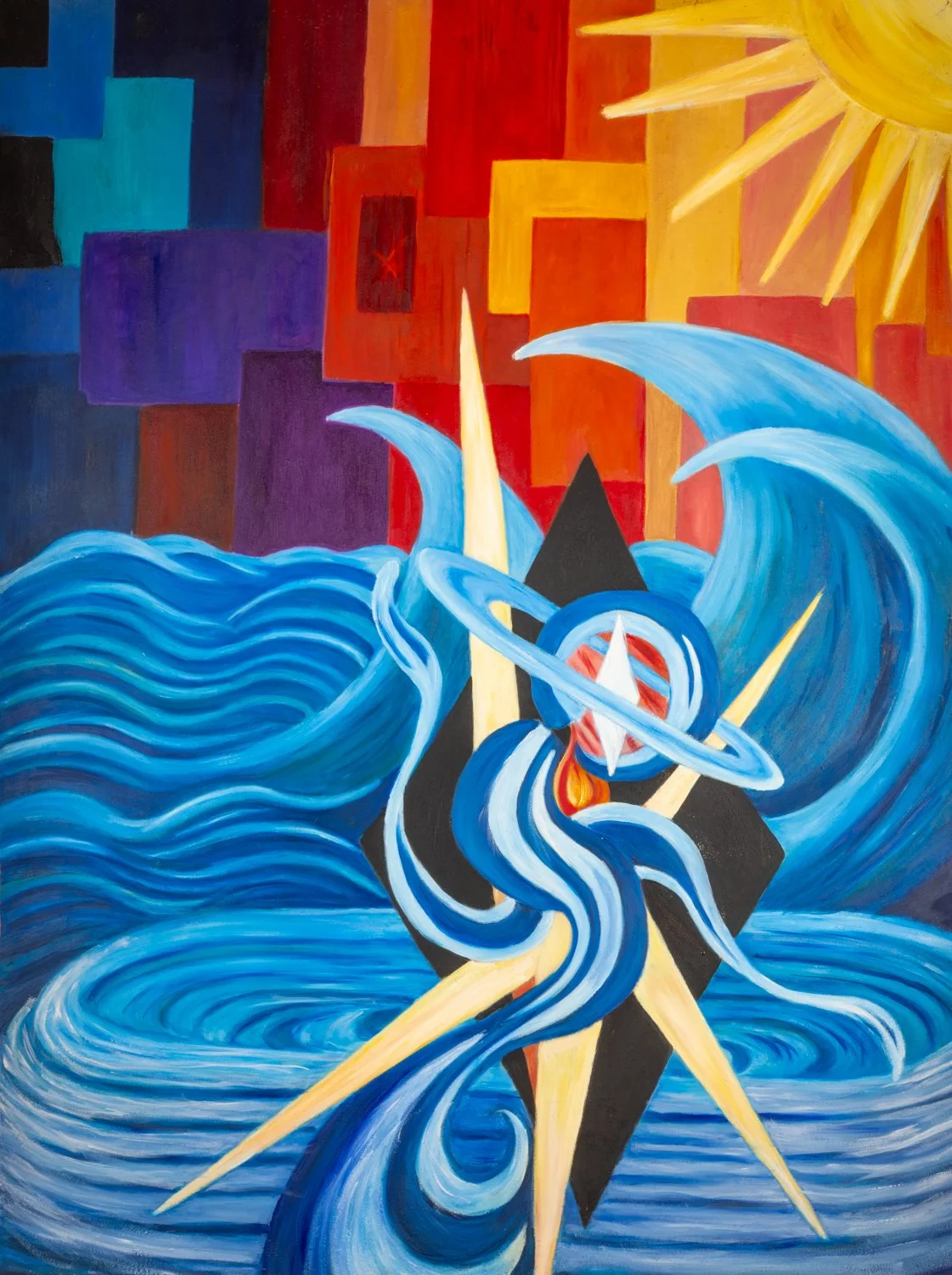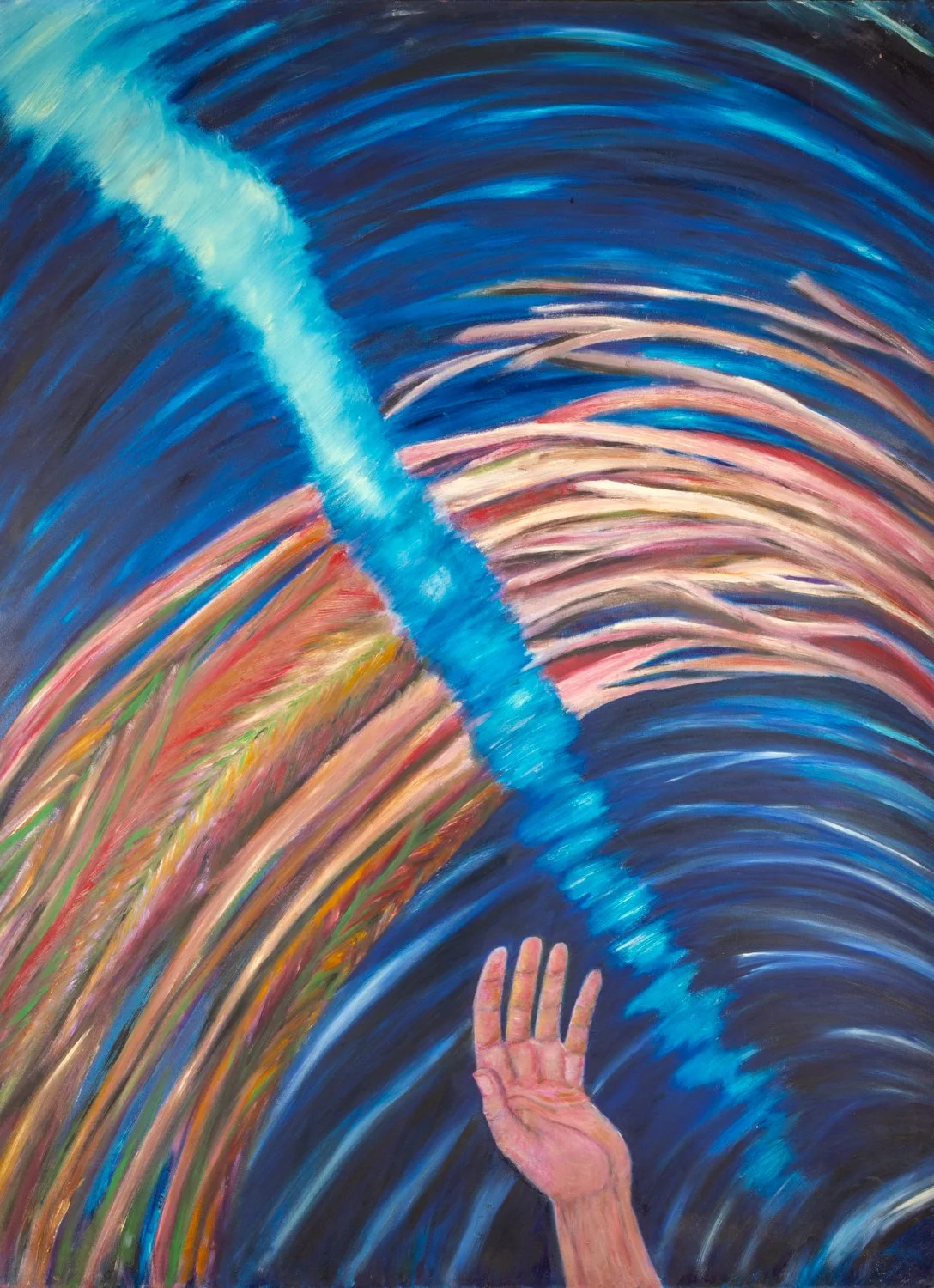 In the Apostle’s Creed, following his crucifixion, Jesus descends into hell. In this imadg, Jesus is an energy in light form that cleaves the darkness of hell into bands of color. Meanwhile the hand of the devil, on the left, contemplates his next move.