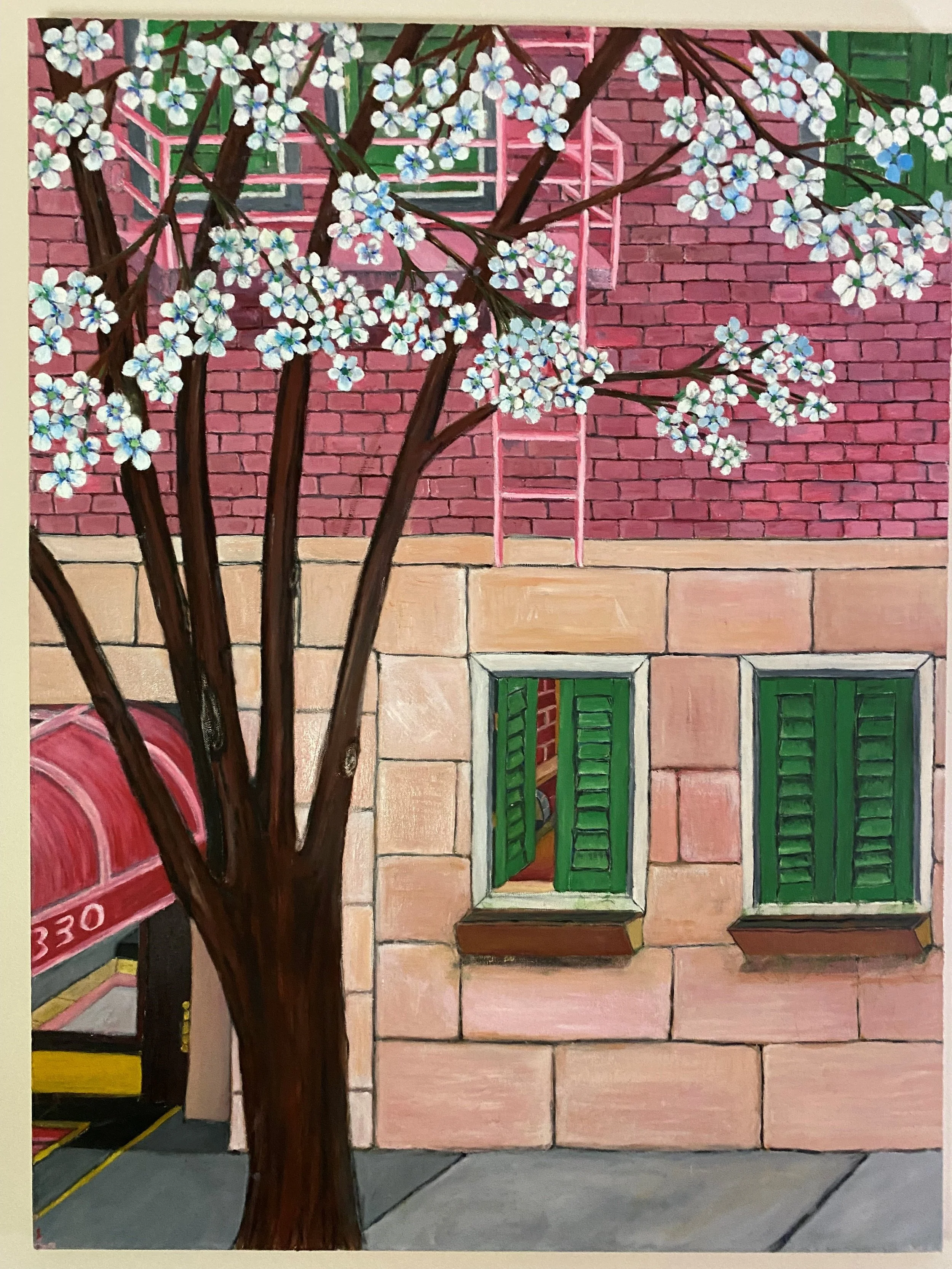East 83rd Street in Yorkville is typical of many of the small, side streets on the Upper East Side -resplendent in pillows of white dogwood flowers that bloom each spring. The colors of spring, recreated in this typical scene, help capture the brightness of the season.